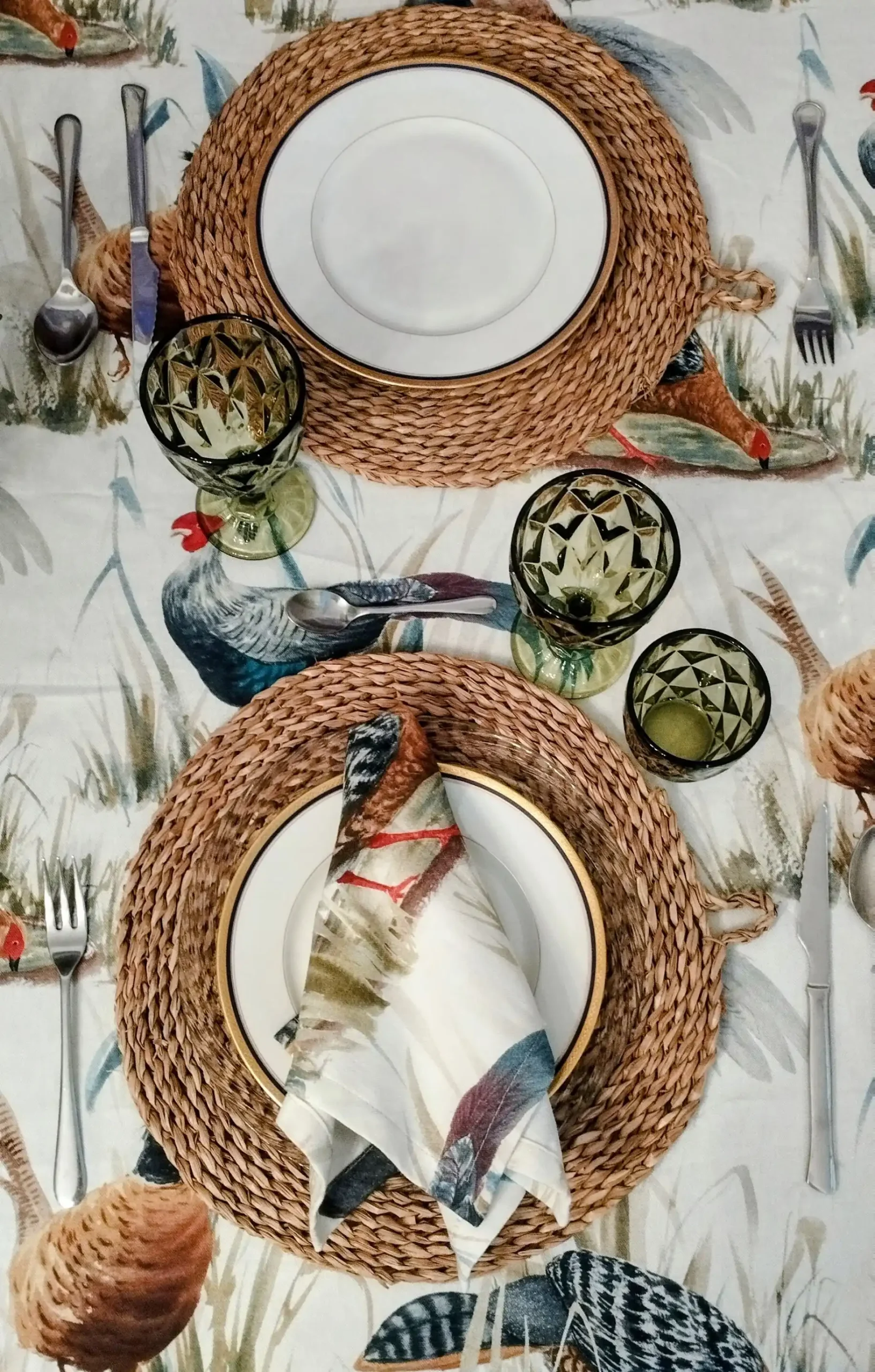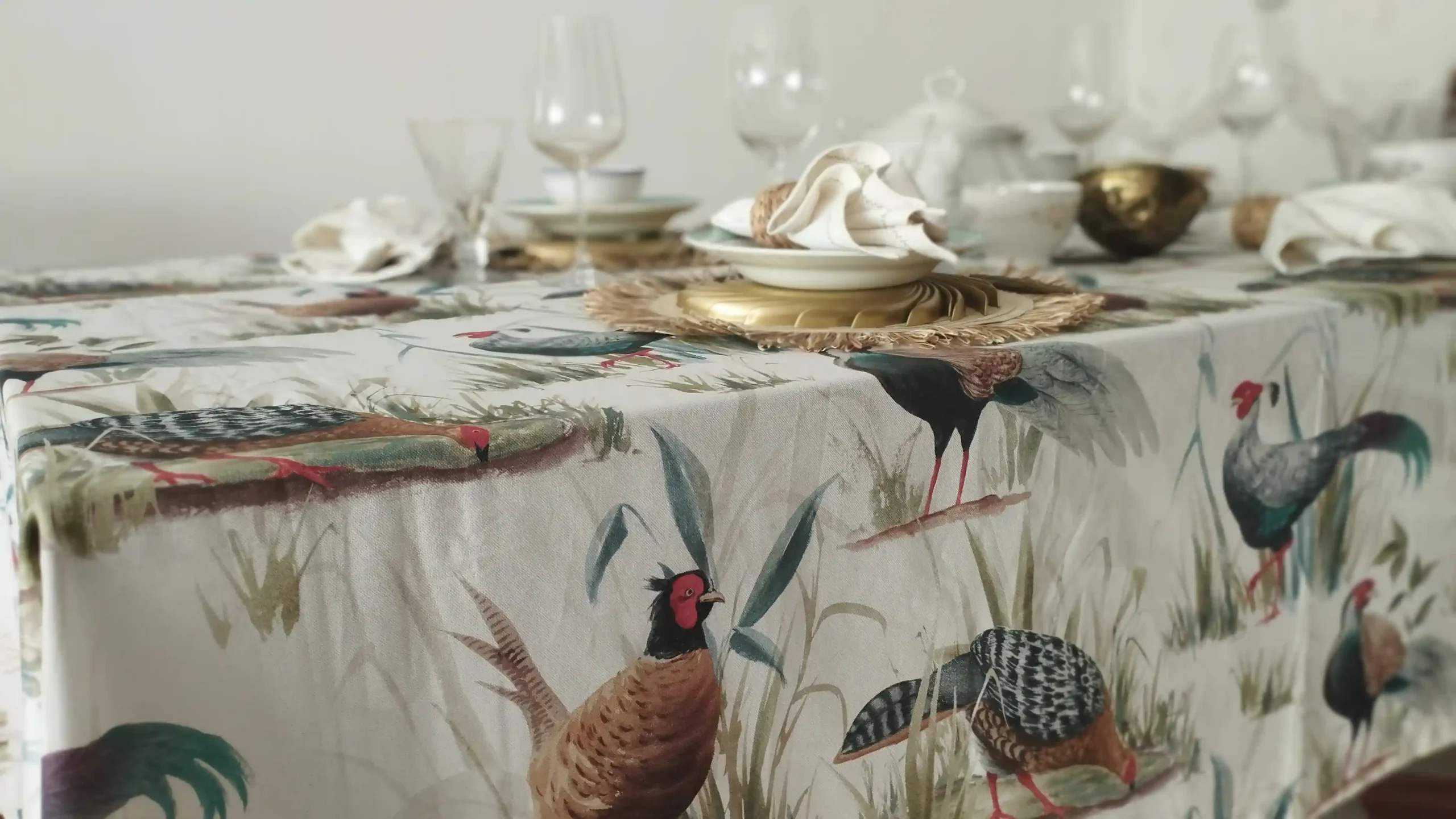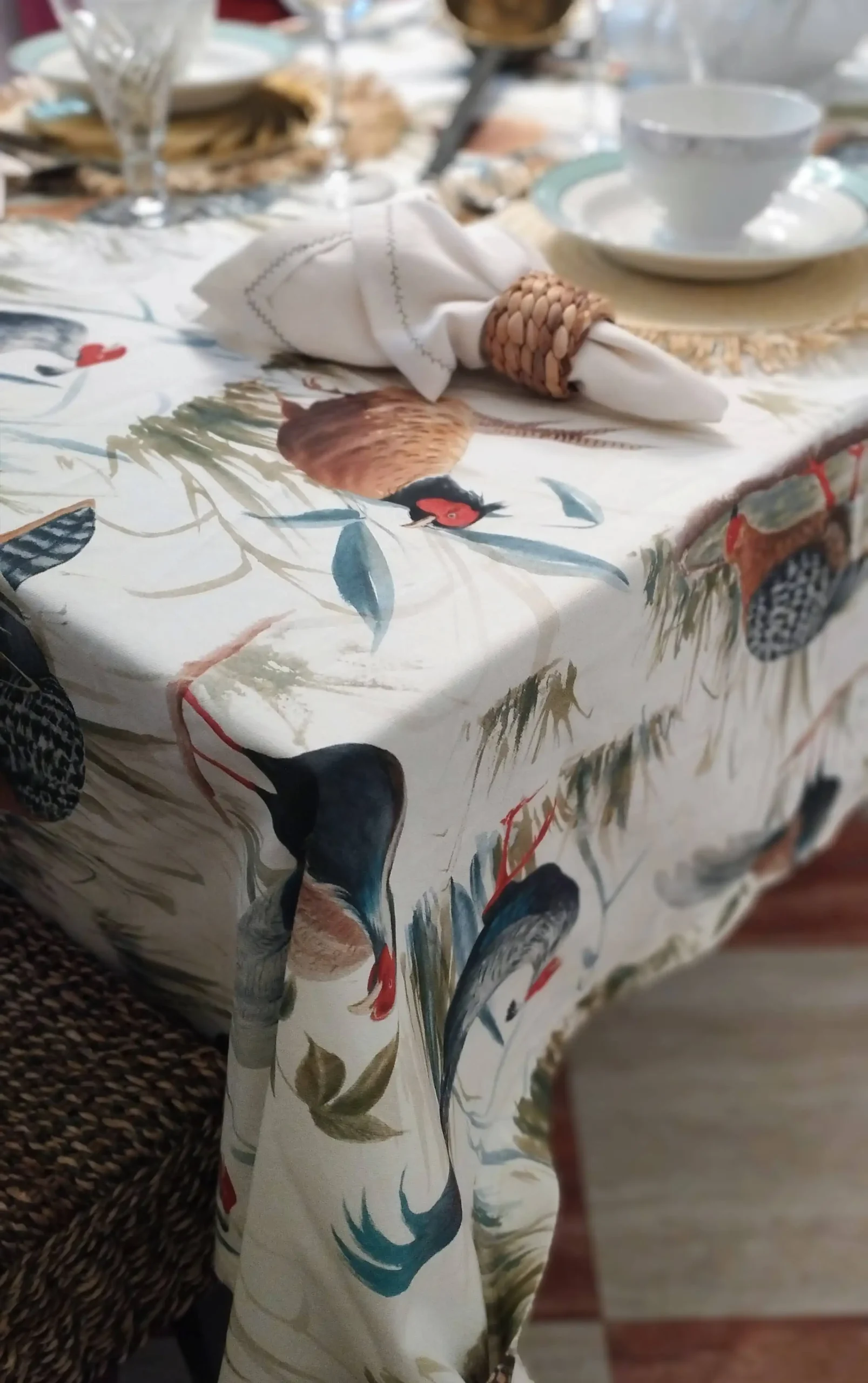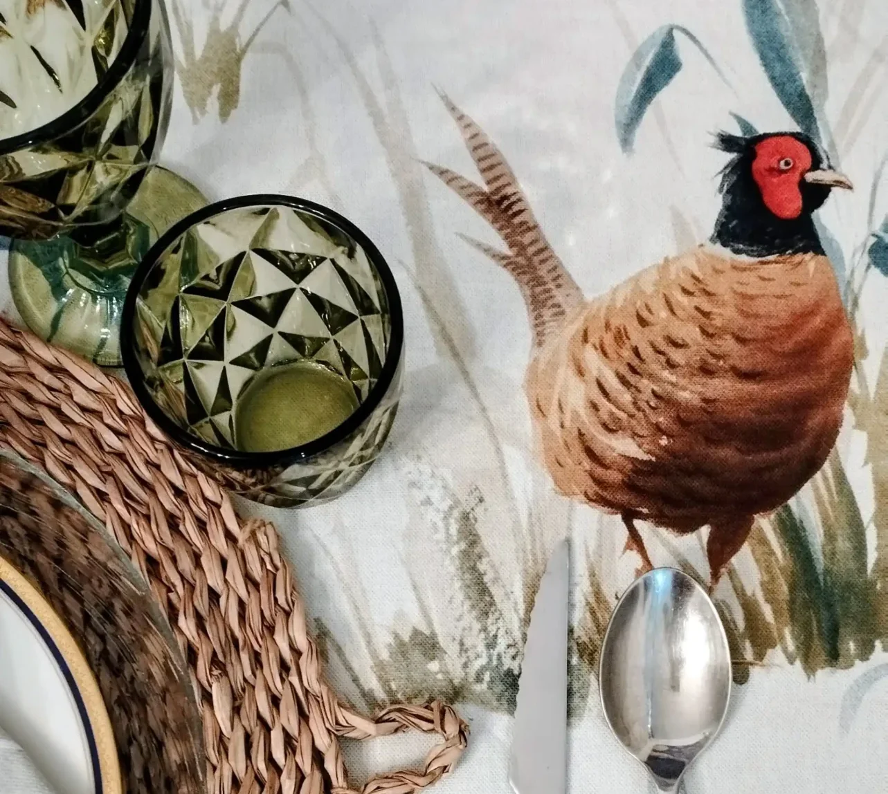 Un mantel de algodón con diseño de faisanes que aporta elegancia natural y un encanto sofisticado a tu mesa.
