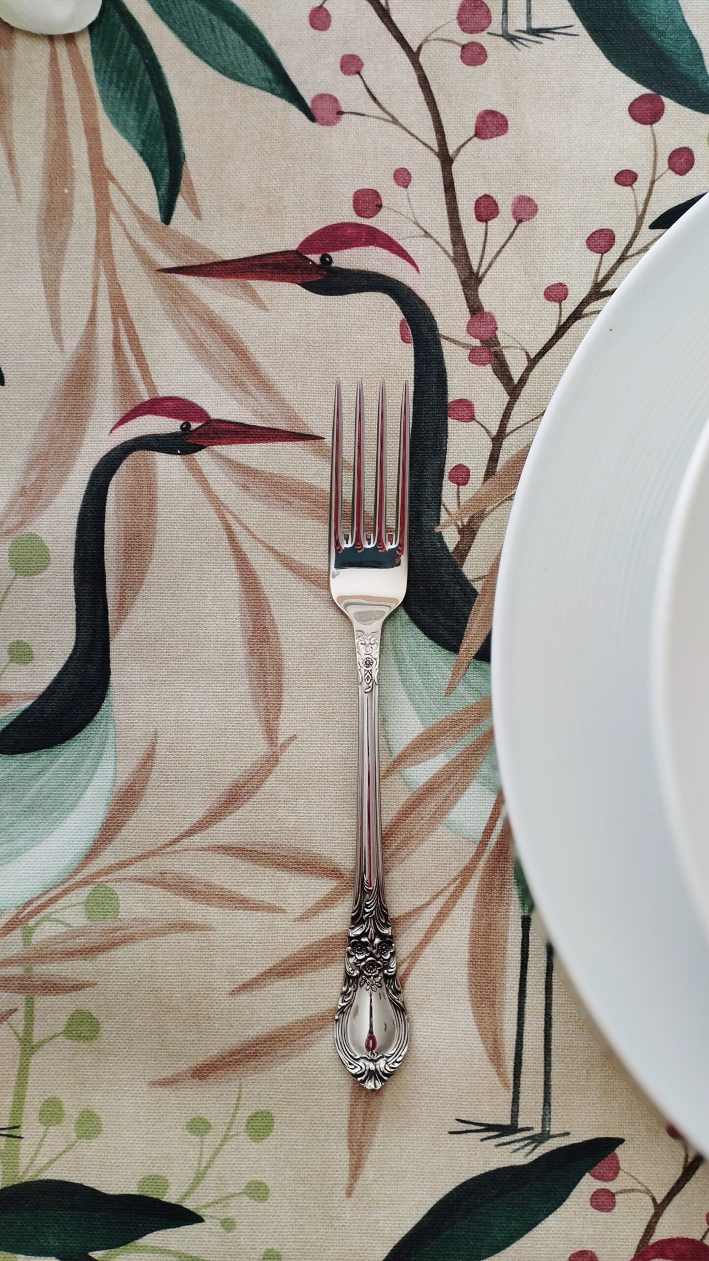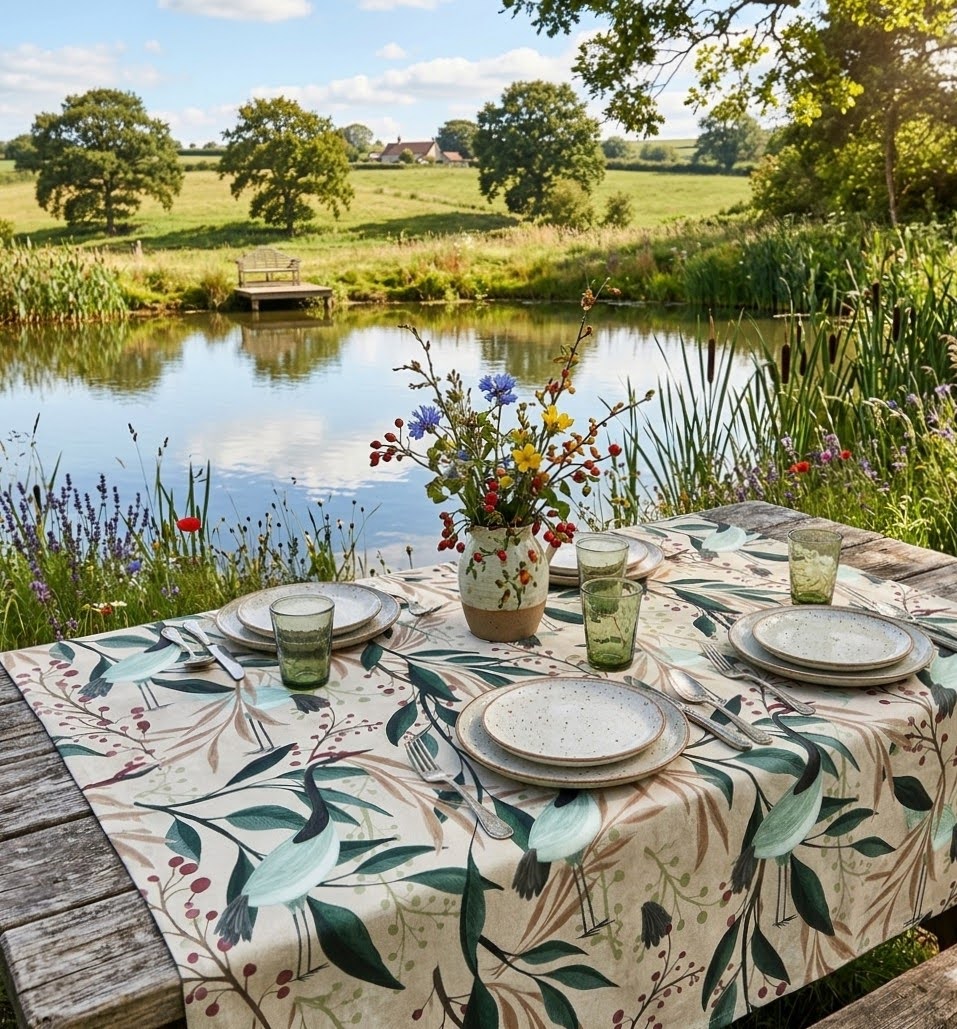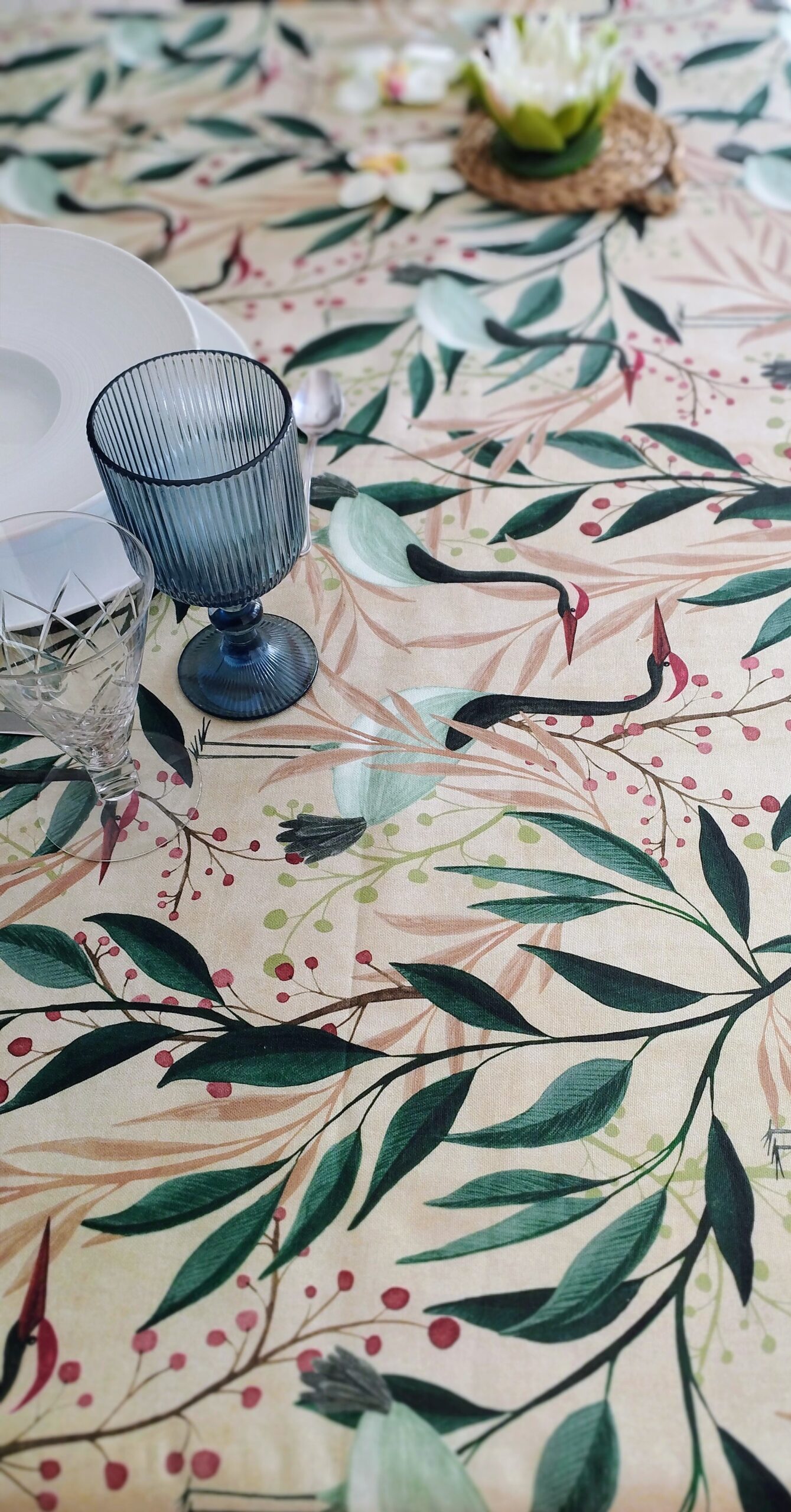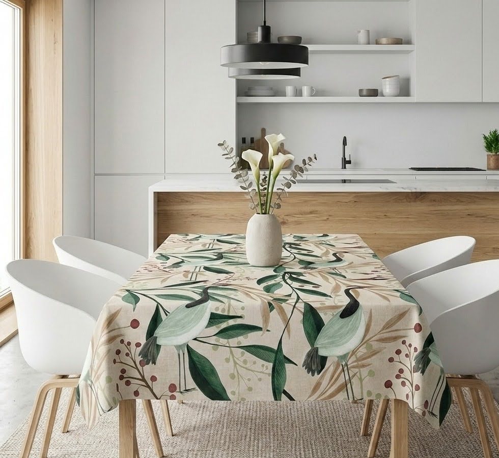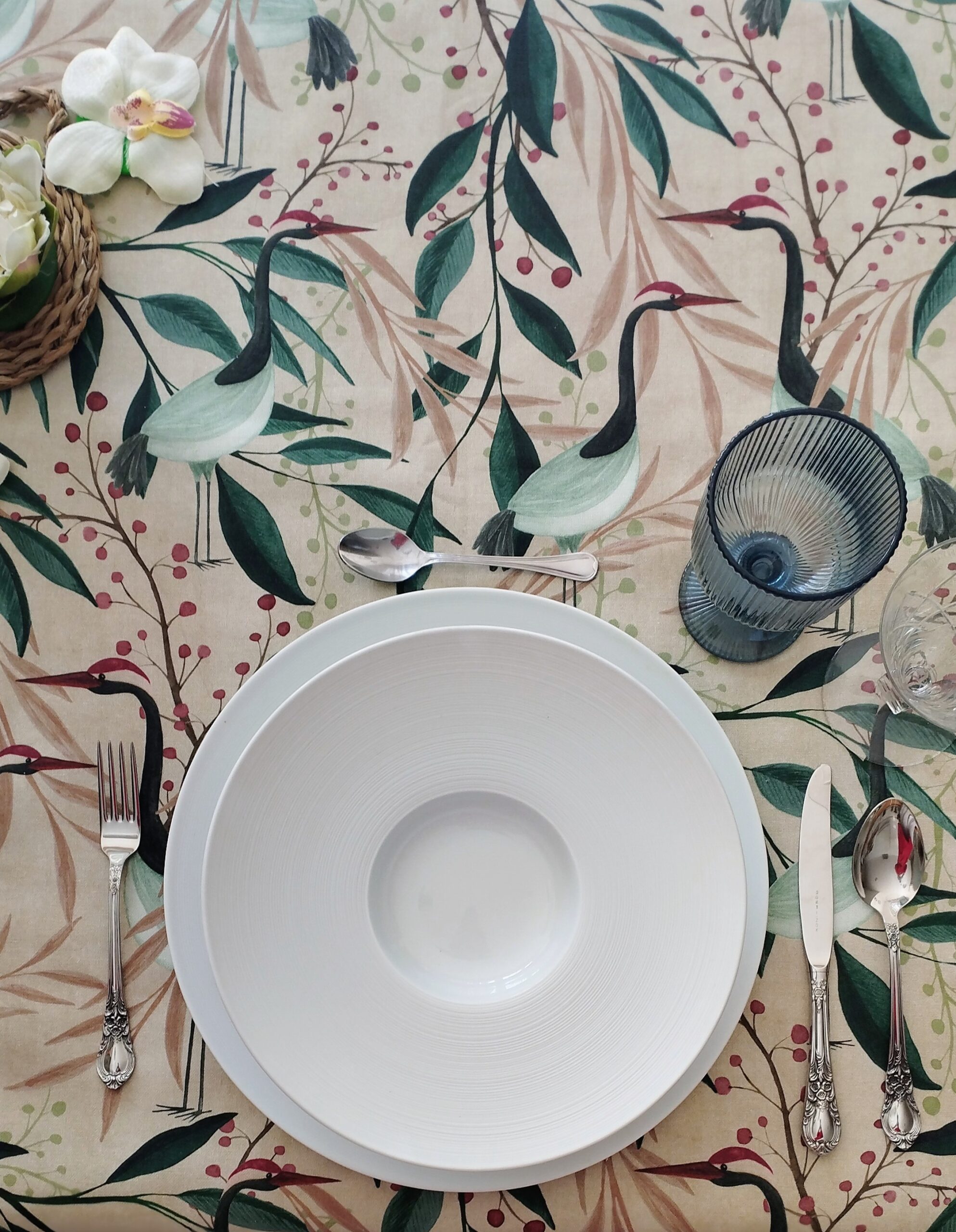 Un mantel de algodón con diseño de grullas en tonos azul turquesa que aporta elegancia natural y un encanto sofisticado a tu mesa.