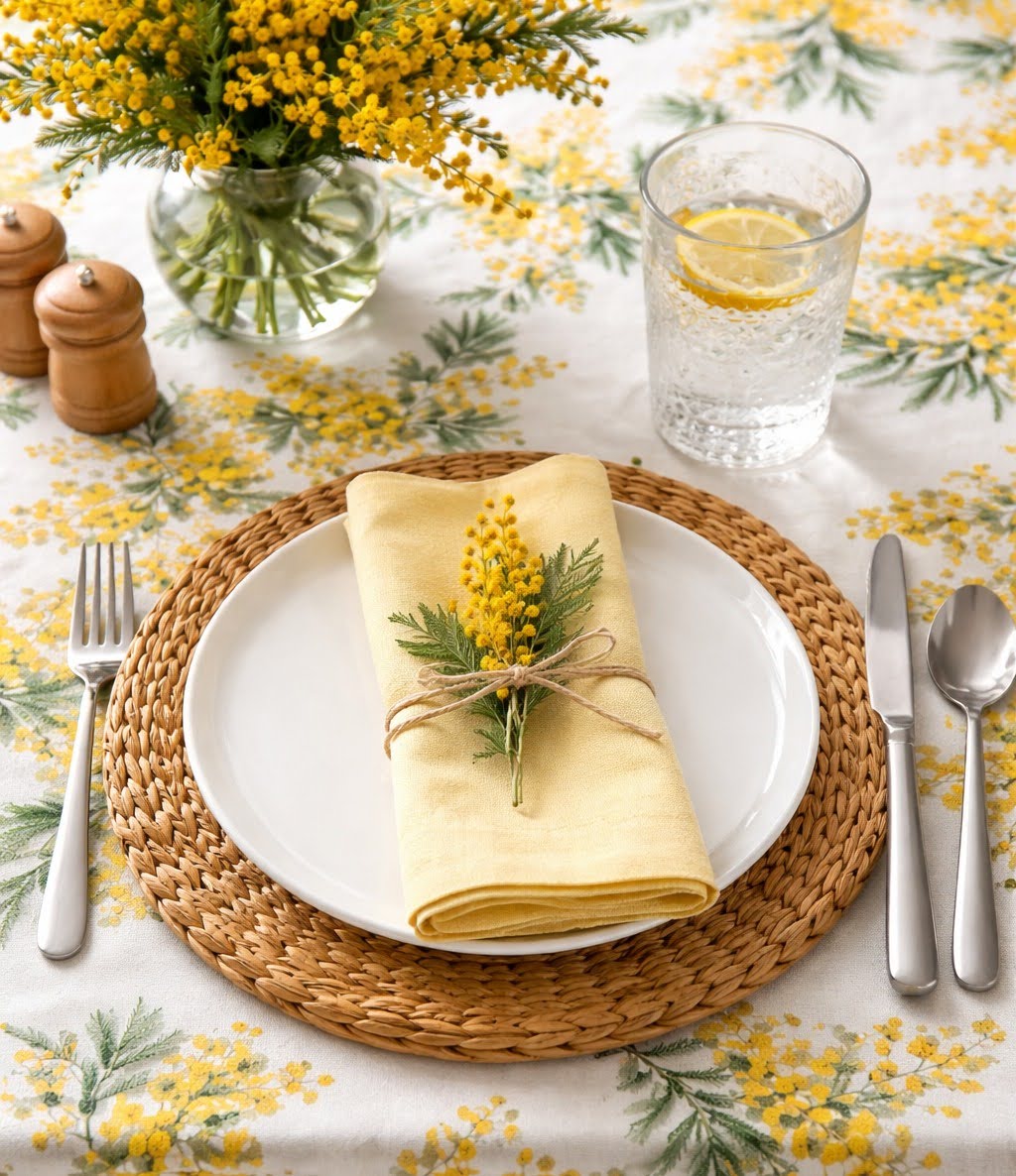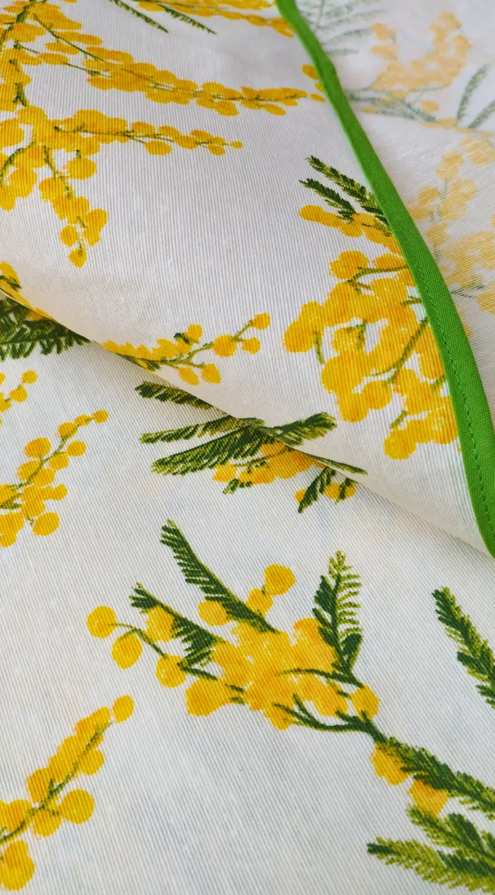 El mantel “Mimosas” aporta frescura y luminosidad a la mesa con un delicado estampado floral en tonos amarillos y verdes sobre fondo claro. Inspirado en la flor de la mimosa, su diseño transmite naturalidad y un aire primaveral que encaja tanto en ambientes rústicos como en espacios más contemporáneos.