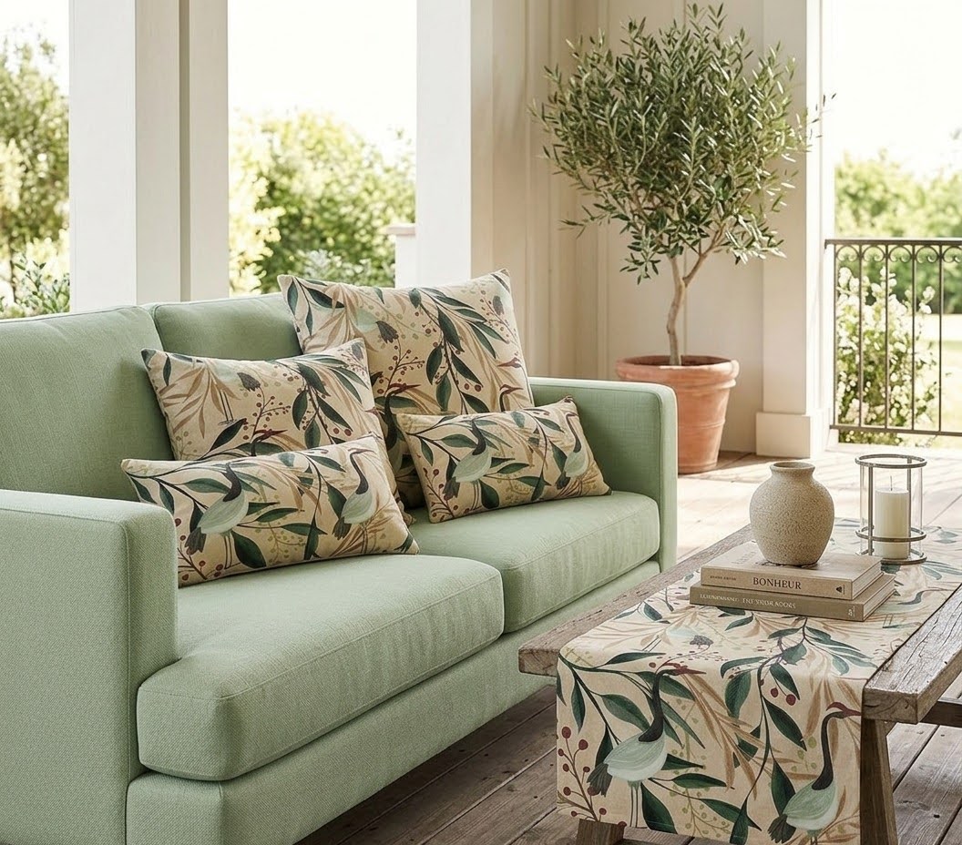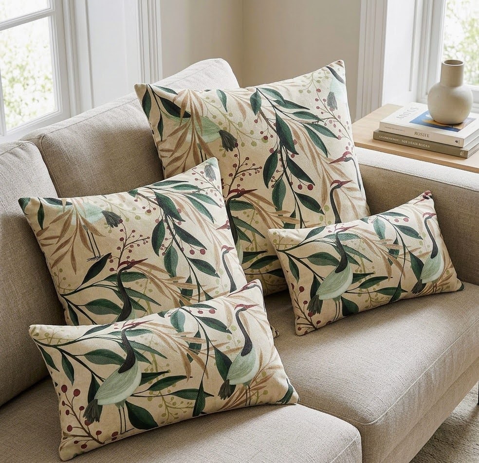 Los cojines «grulla azul» estan confeccionados en algodón orgánico 100%, aportando cuerpo ,suavidad y elegancia, un tejido de calidad premium ideales para ambientes modernos con personalidad ecléctica.