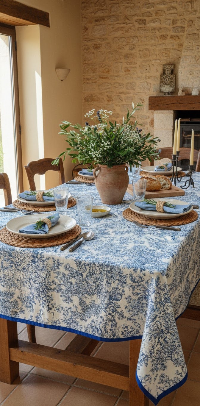 El mantel Toile de Jouy combina la elegancia del clásico estampado francés. Su diseño atemporal, con escenas y motivos delicados sobre fondo neutro, aporta distinción y carácter a cualquier mesa, adaptándose tanto a ambientes tradicionales como contemporáneos.